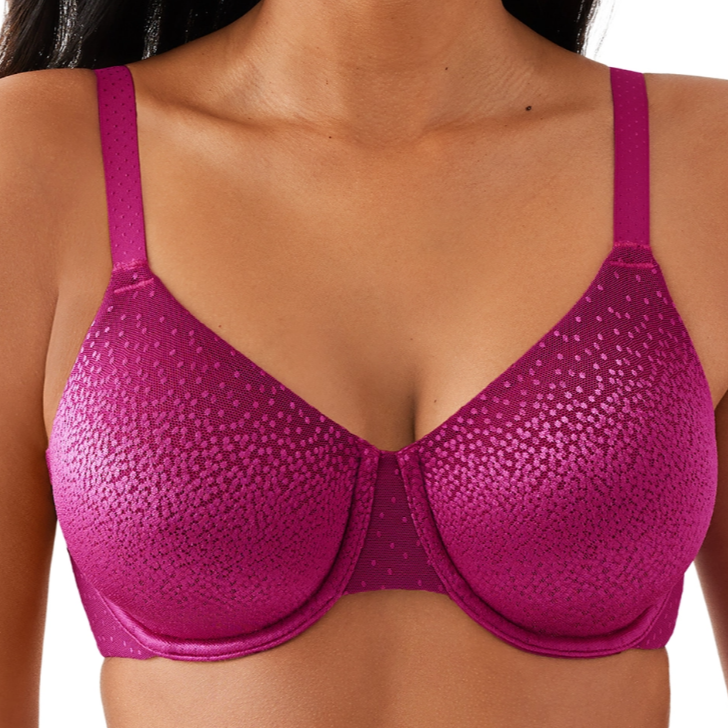 - Full coverage two-ply cups of soft inner fabric covered with pretty dot jacquard fabric with accent sheen