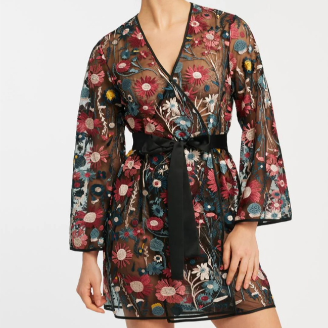 The Botannica Coverup features a romantic all-over embroidered netting in a bouquet of rich colors. Inspired by pressed flowers, this coverup brings an added touch for virutally any look. There’s no question that this coverup can easily be spotted around any chemise, out of the bedroom, or on a cute date night. • V Neckline • Embroidered Netting, Charmeuse • Set-in Belt • Ethically Made • Hand wash cold inside out / Lay flat to dry