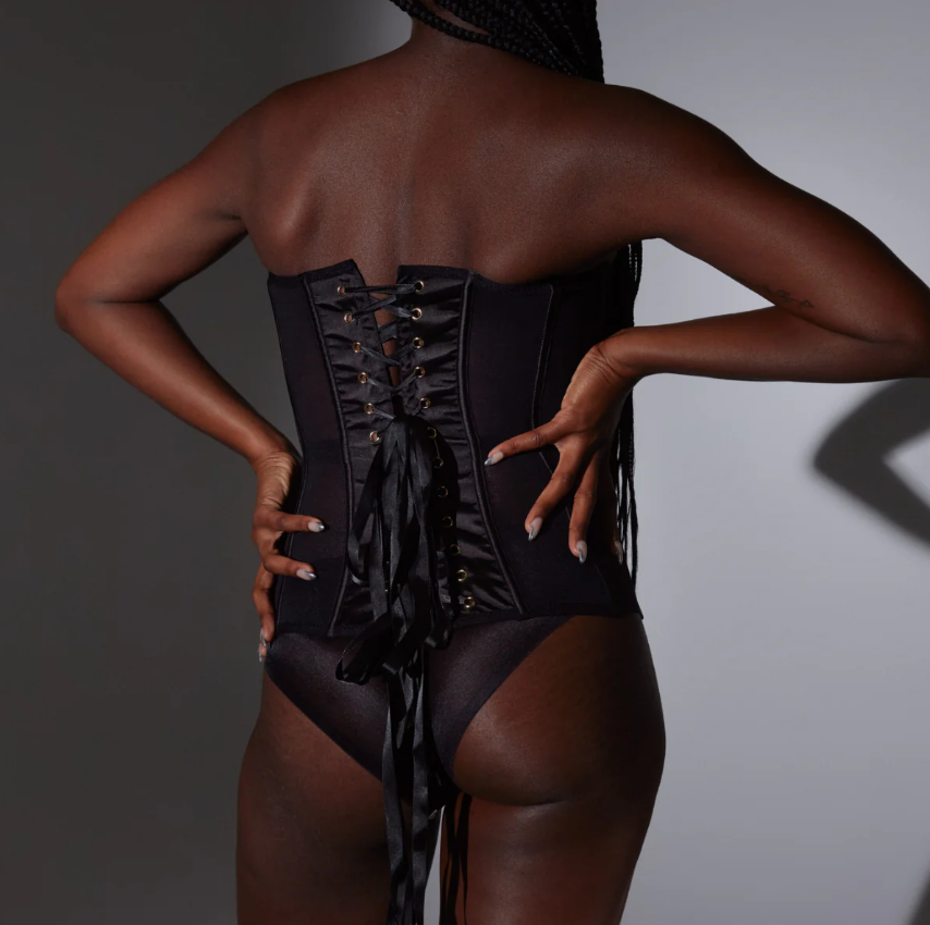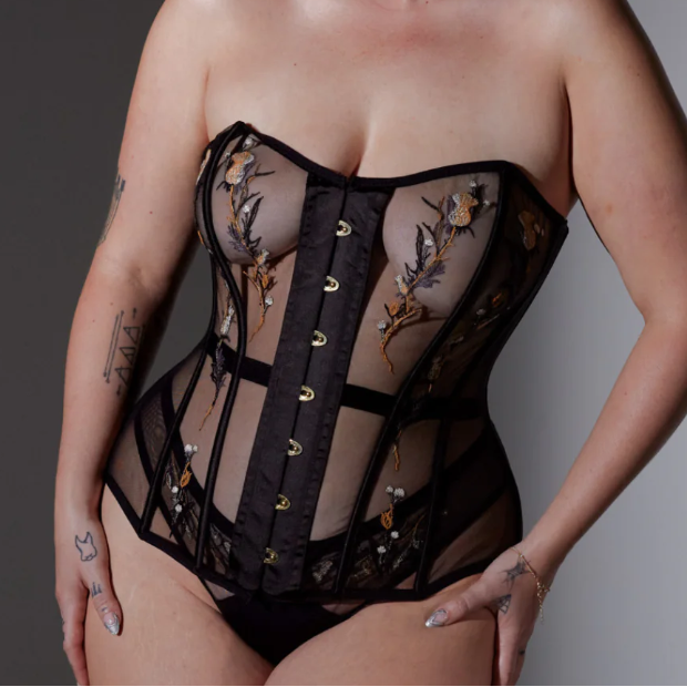 Our iconic Cirsi embroidery takes your corsetry game to the next level with waist-cinched ribbon lacing, front busk and stretch mesh panels. Front fastening hooks and strong shaping boning from hip through bust.