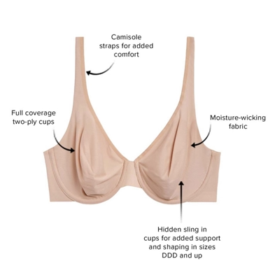 - Hidden sling in cups for added support and shaping in sizes DDD and up