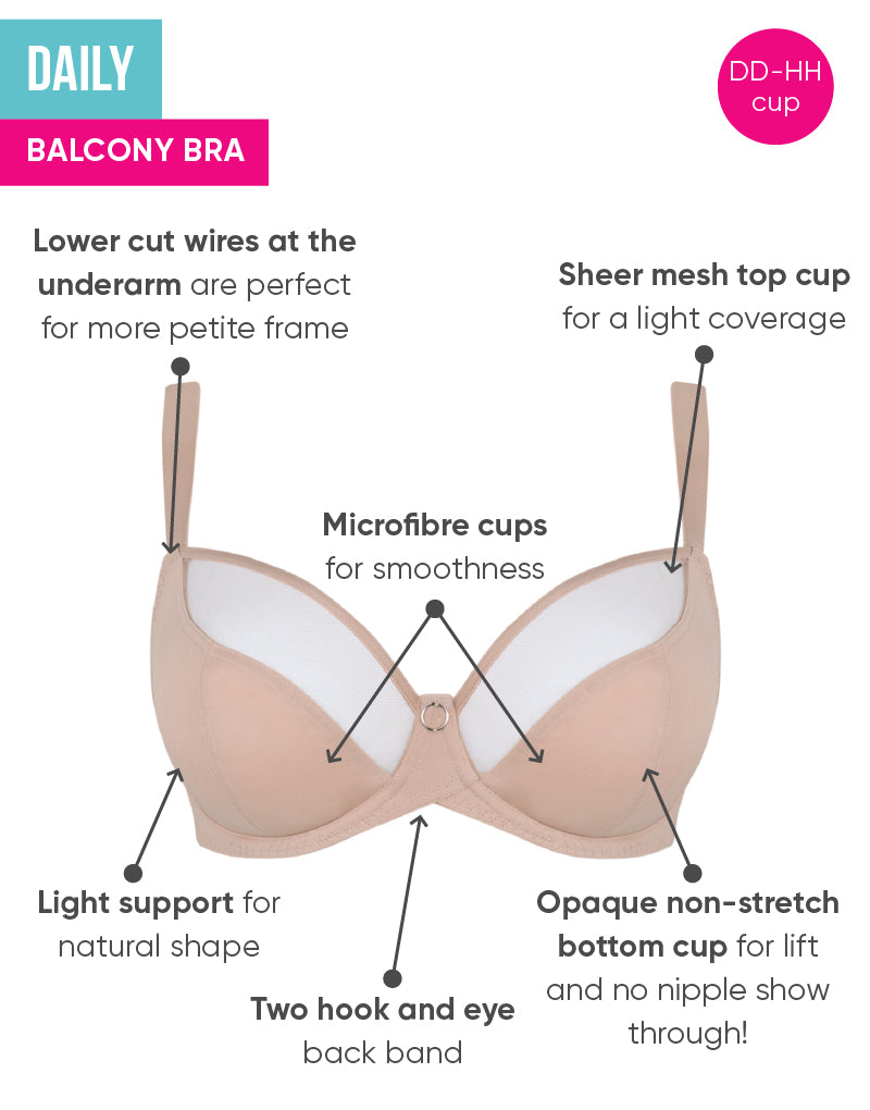 This is your new every day bra! Daily Balcony keeps things simple and super cool as the microfibre cups offer a smooth rounded shape and our unique Up Front Technology ensures forward projection and uplift! A curved up under band offers sublime comfort.