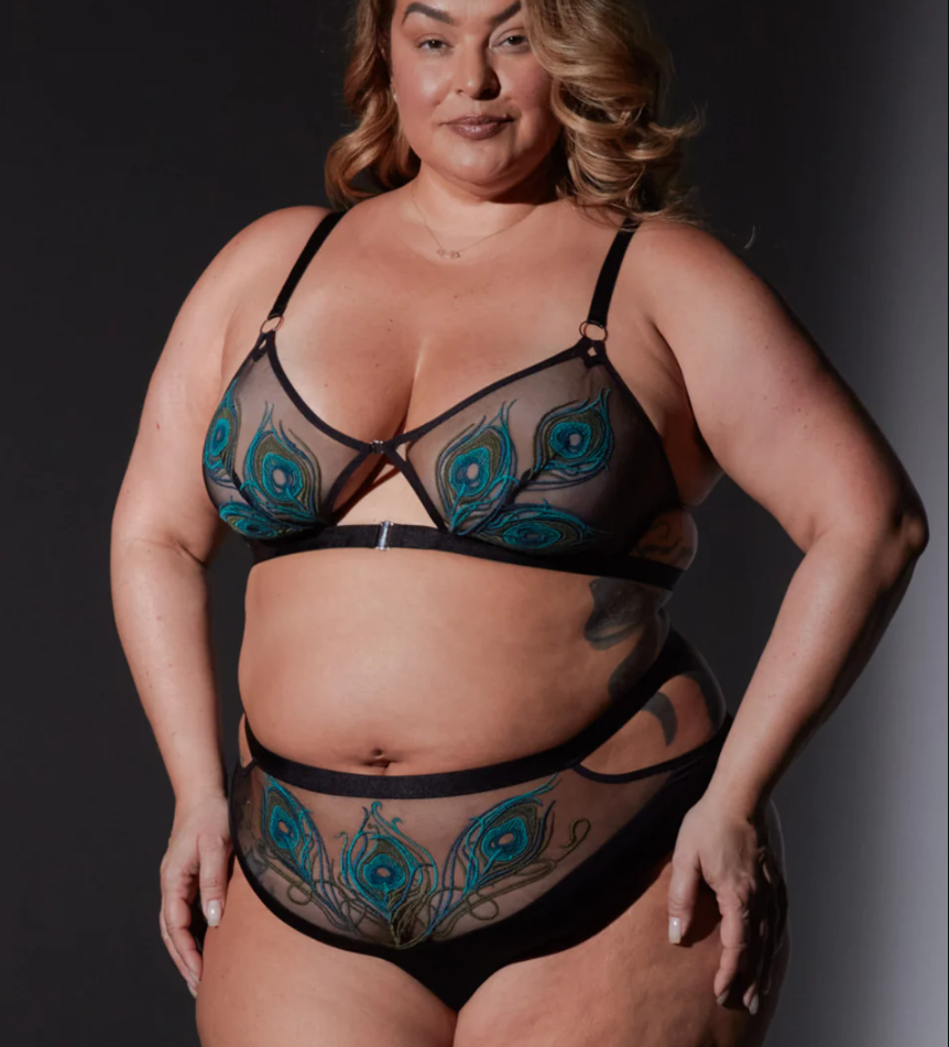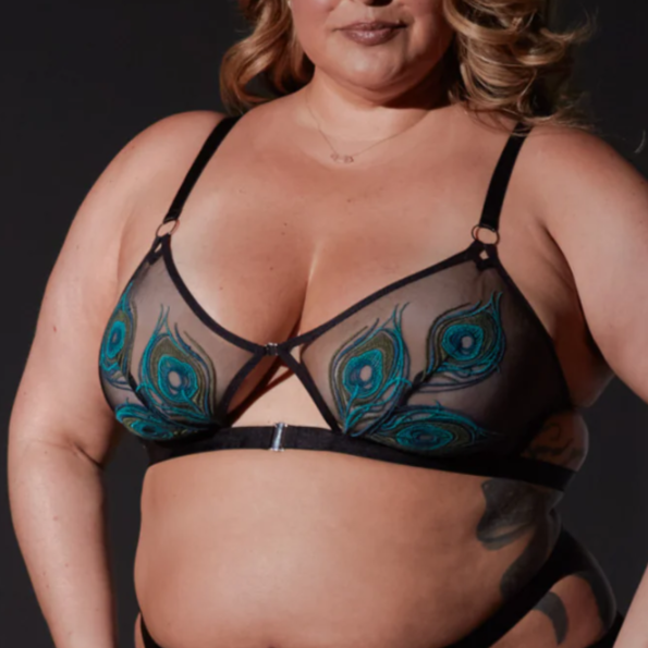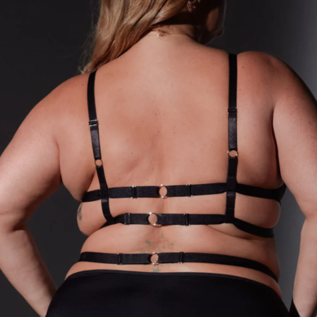 Tulle Bralette with hardware O ring accents, keyhole cutouts, and double slide lock closures at center front.
