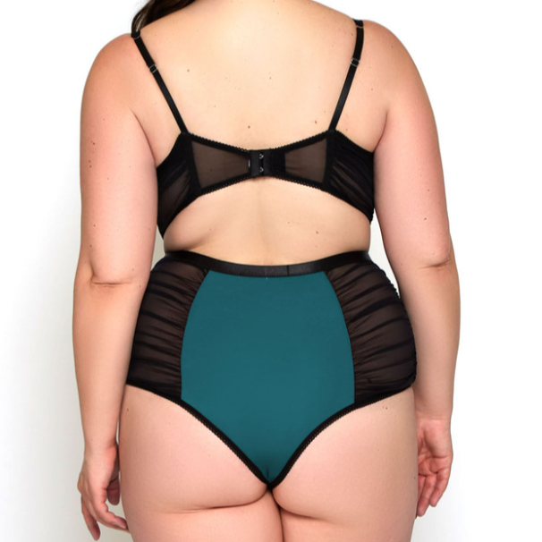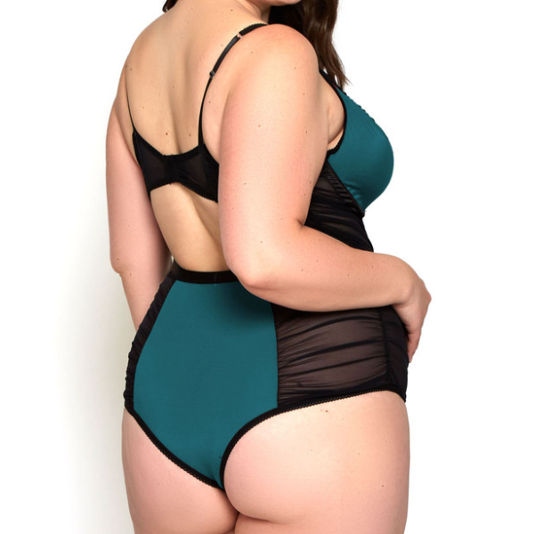 Sexy meets sophistication in this chic two-tone teddy featuring soft underwire cups with a mesh trim, adjustable spaghetti straps, a solid center bodice panel with intricate appliques, ruched mesh sides with a cut-out waist, a hook and eye back closure.