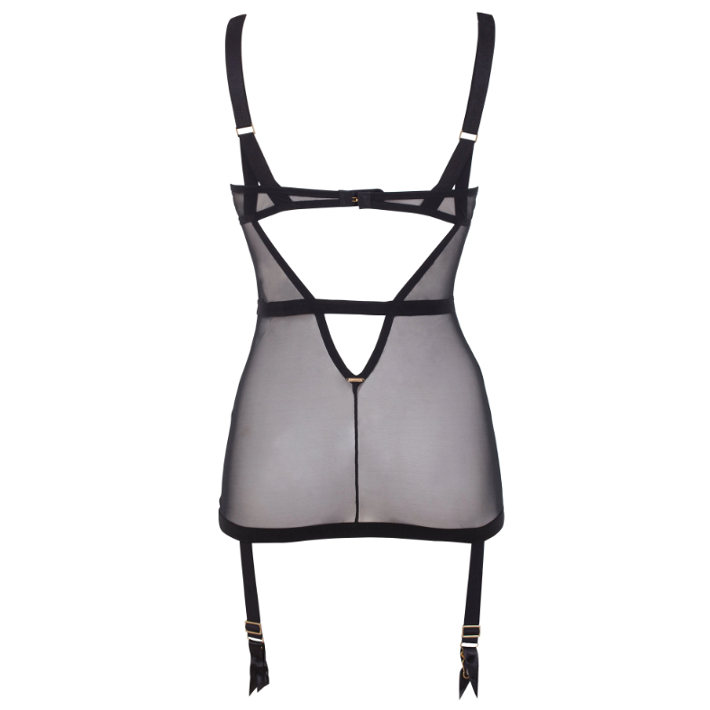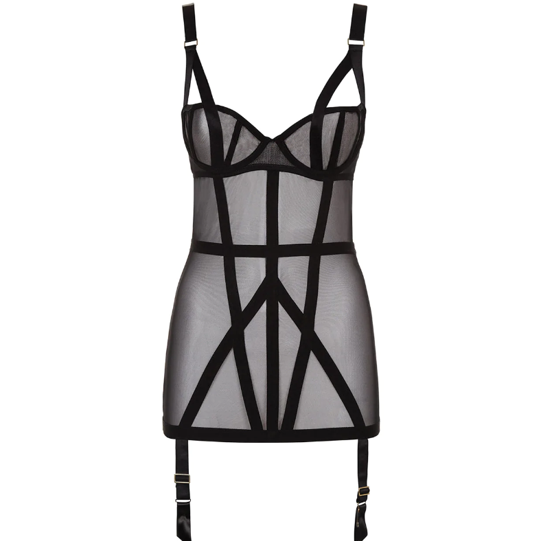 Underwired balcony bra with soft boning gives shape and curve, whilst the softly elasticated mesh body enhances the silhouette.