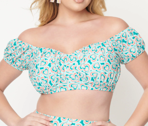 This stunning 1940s style swimwear top is crafted in a turquoise retro hearts print that will make you stand out on the beach. The off the shoulder design adds a touch of elegance, while the short puff sleeves create a playful and feminine look. With elastic shoulders and cuffs, this top ensures a comfortable fit that stays in place even during your wildest water adventures. The padded cups provide extra support and enhance your natural curves, giving you confidence as you soak up the sun. Plus, the back tie allows for easy adjustment to find your perfect fit every time.