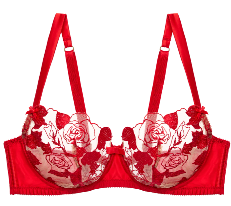 Rosabelle bra is underwired, sheer cup embroidered bra with dramatic detailing. A sheer support sling in the bra cup ensures lift and shape without bulk. Satin straps and ribbon trims.