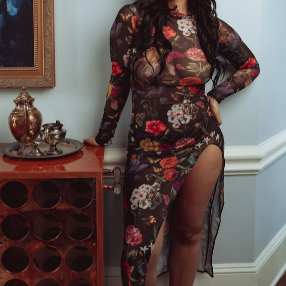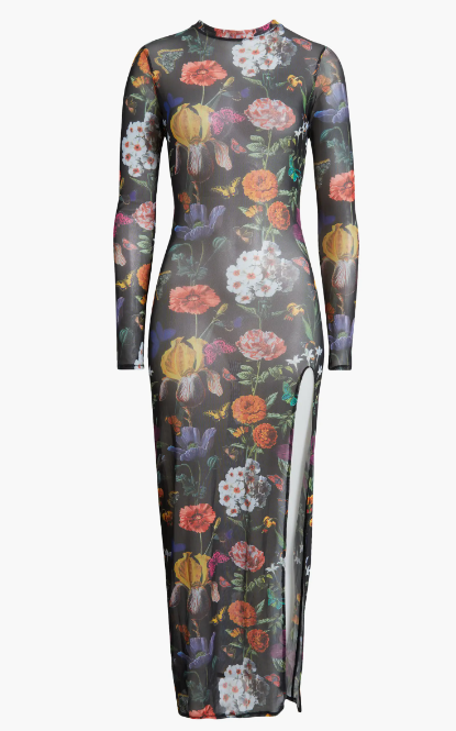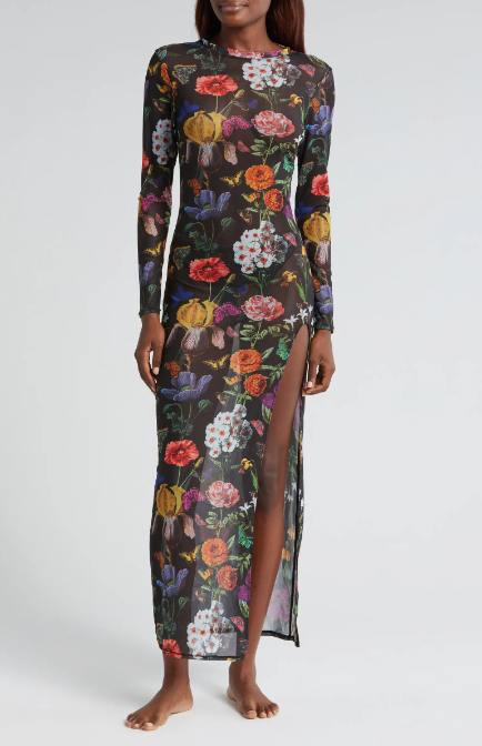 A vibrant botanical print brightens this slinky semi-sheer maxi.