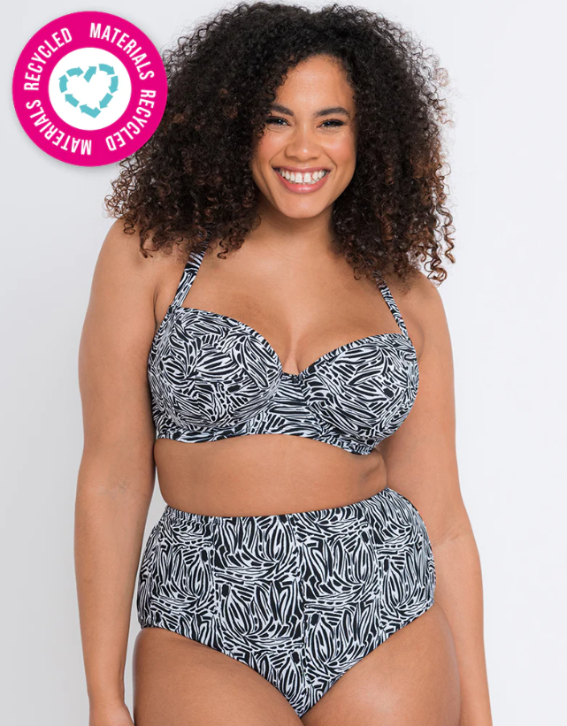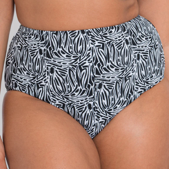 Sundown High Waist Bikini Brief in gorgeous monochrome abstract print. This brief sits high on the waist to define and skim over your curves, giving that hourglass effect. Made with recycled fibres and Xtra-Life Lycra designed to prolong the life of your swimwear so you can bring the 'Bond girl' energy every holiday!
