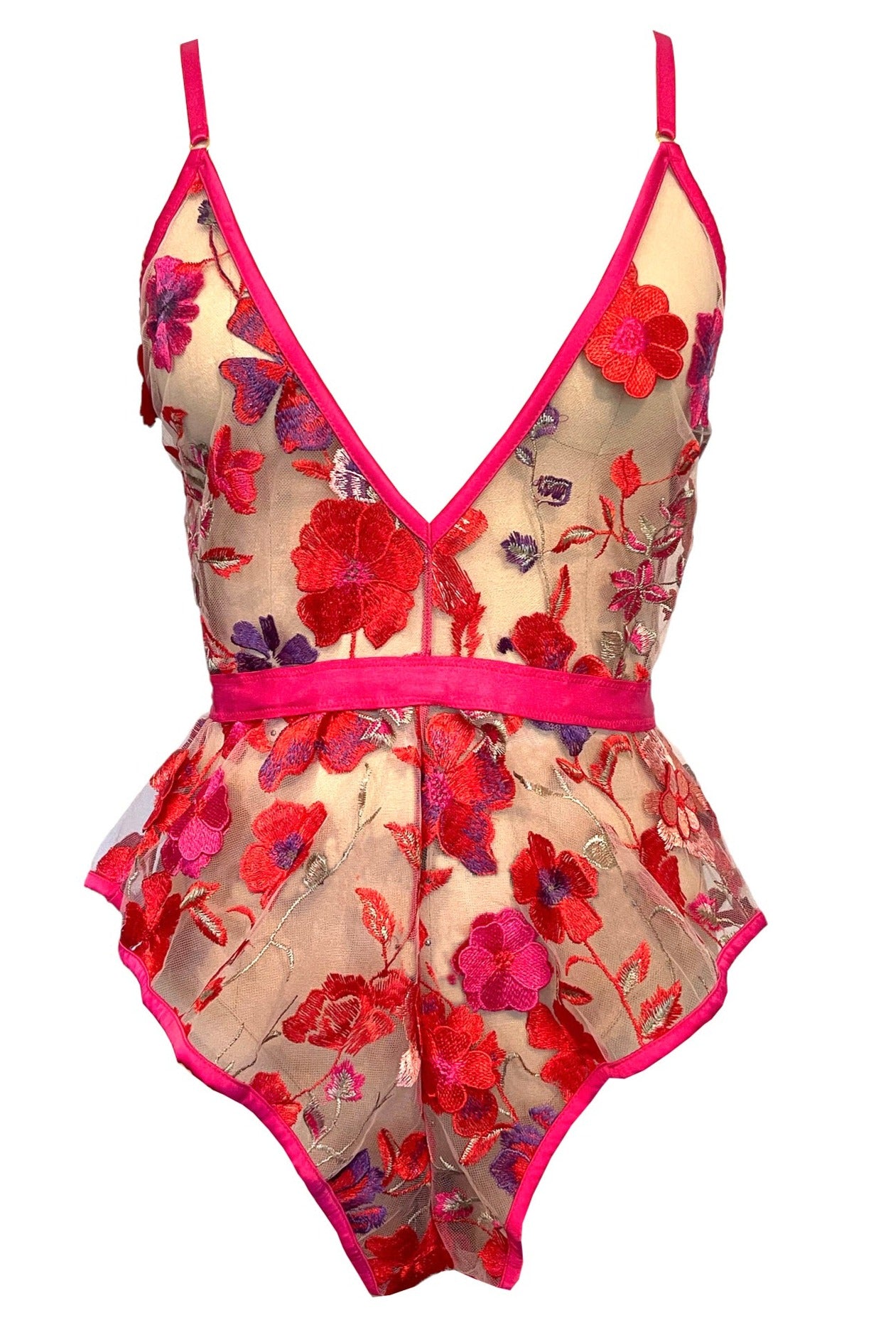 Introducing our TEDDY BRIGHT FLORAL - a must-have for those who appreciate stunning 3-d floral embroidery. With a deep V-neck, elastic waistband, and adjustable straps, this teddy is both feminine and comfortable. The contrasting satin trim adds the perfect touch of elegance to this already irresistible piece.