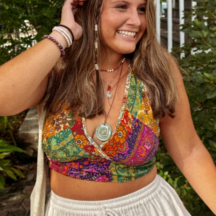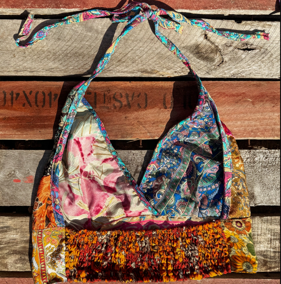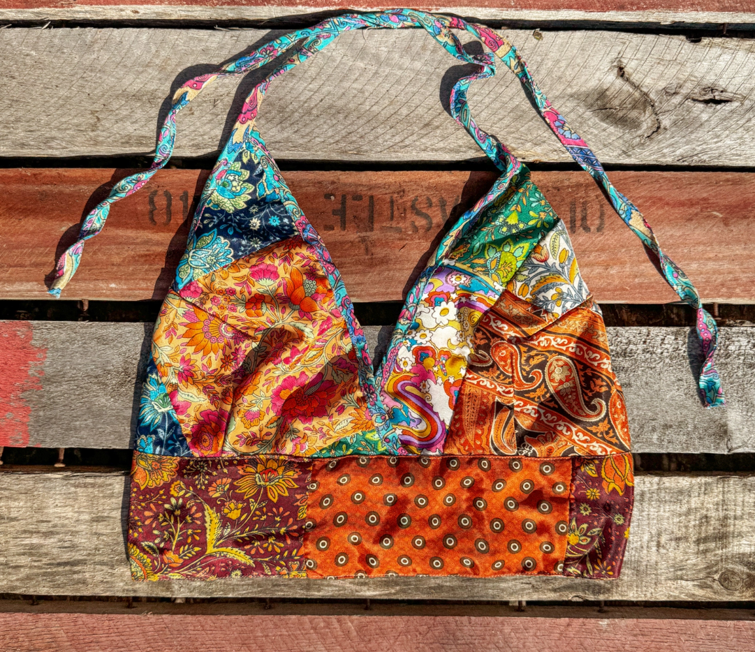 Reversible beachy boho colorful patchwork bralette! Elastic back for comfort and halter ties. Each is one of a kind and unique, all are beautiful. Made with 100% silk patches